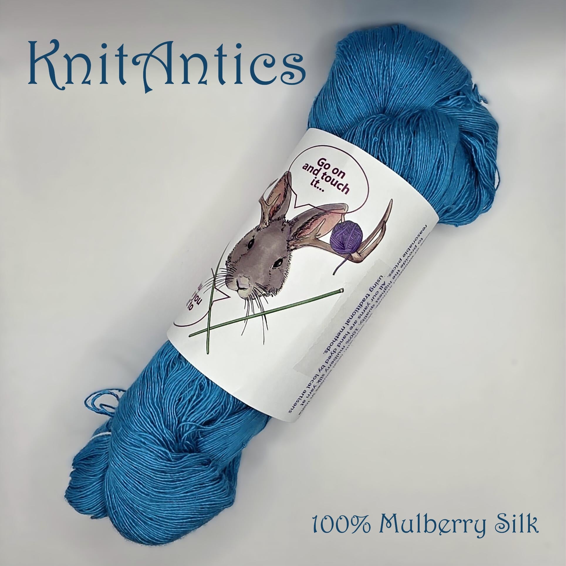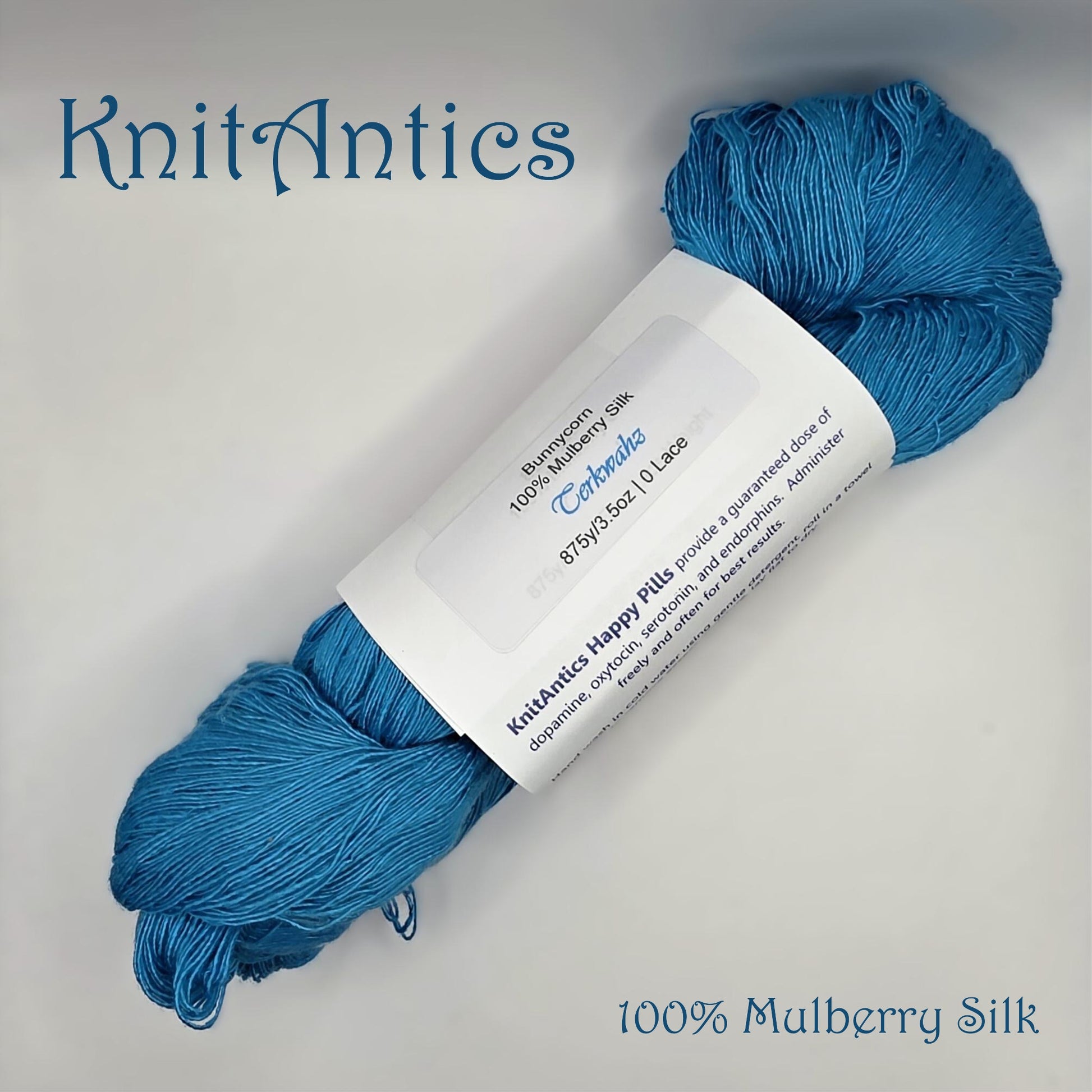 This yarn is created from 100% mulberry silk spun from long fibers remaining after the primary reeling process. The bright turquiose color is rich and engaging, hand-dyed to perfection using traditional techniques.