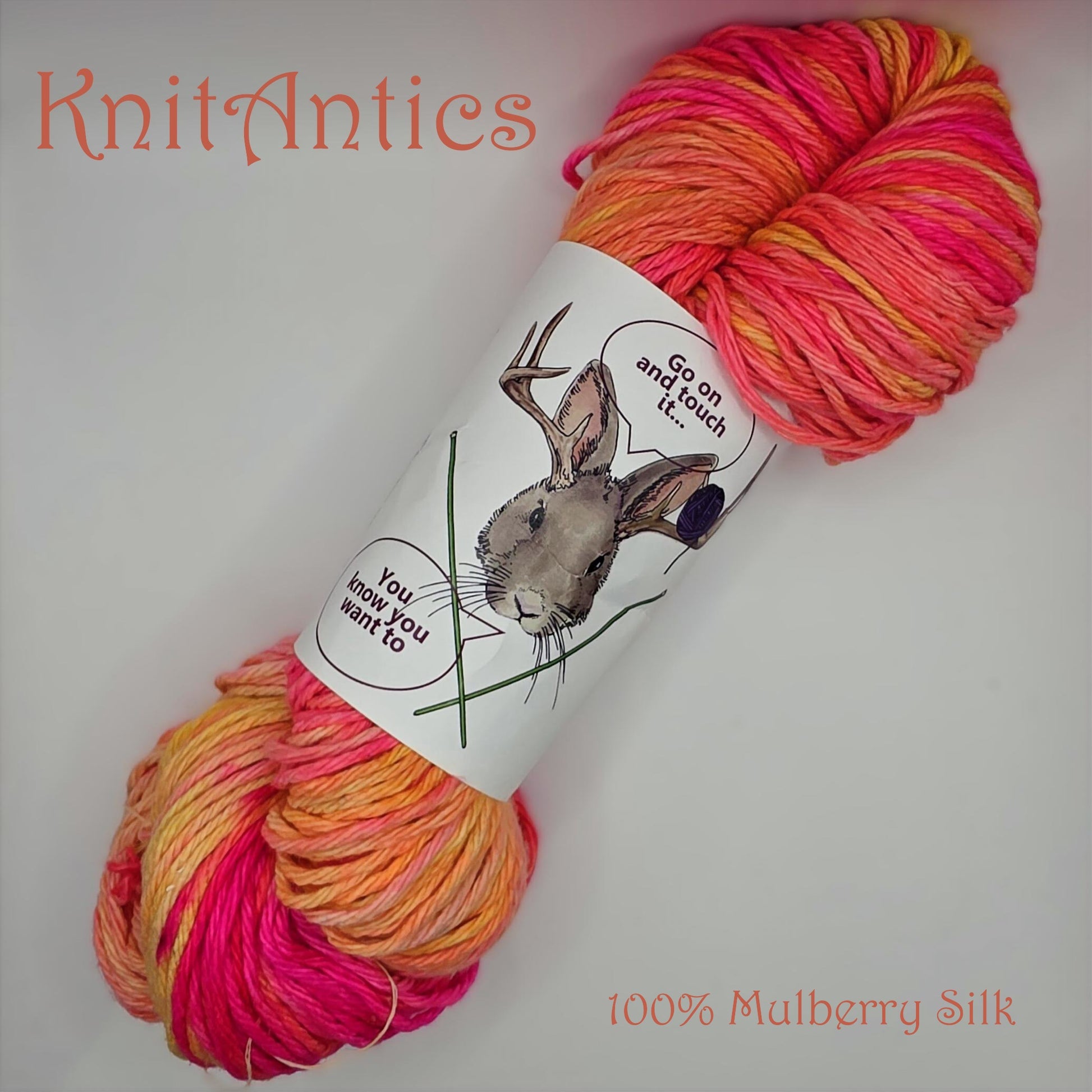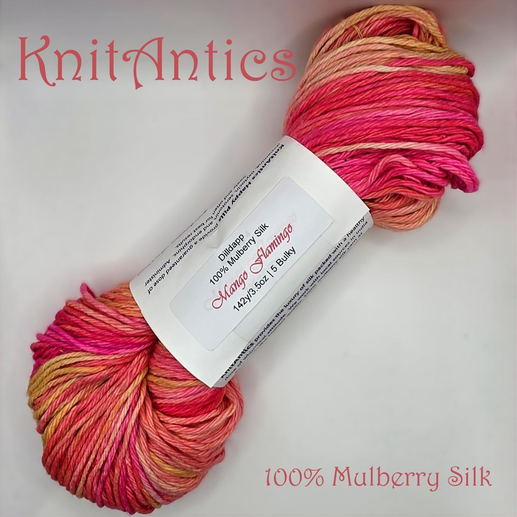 This yarn is created from 100% mulberry silk spun from the shortest fibers remaining after the primary reeling and spinning processes. The color is rich and engaging, a combination of pink and orange, imagine a flamingo sipping on a boat drink in the Bahamas. Traditional dyeing techniques are used to create this bright colorway.