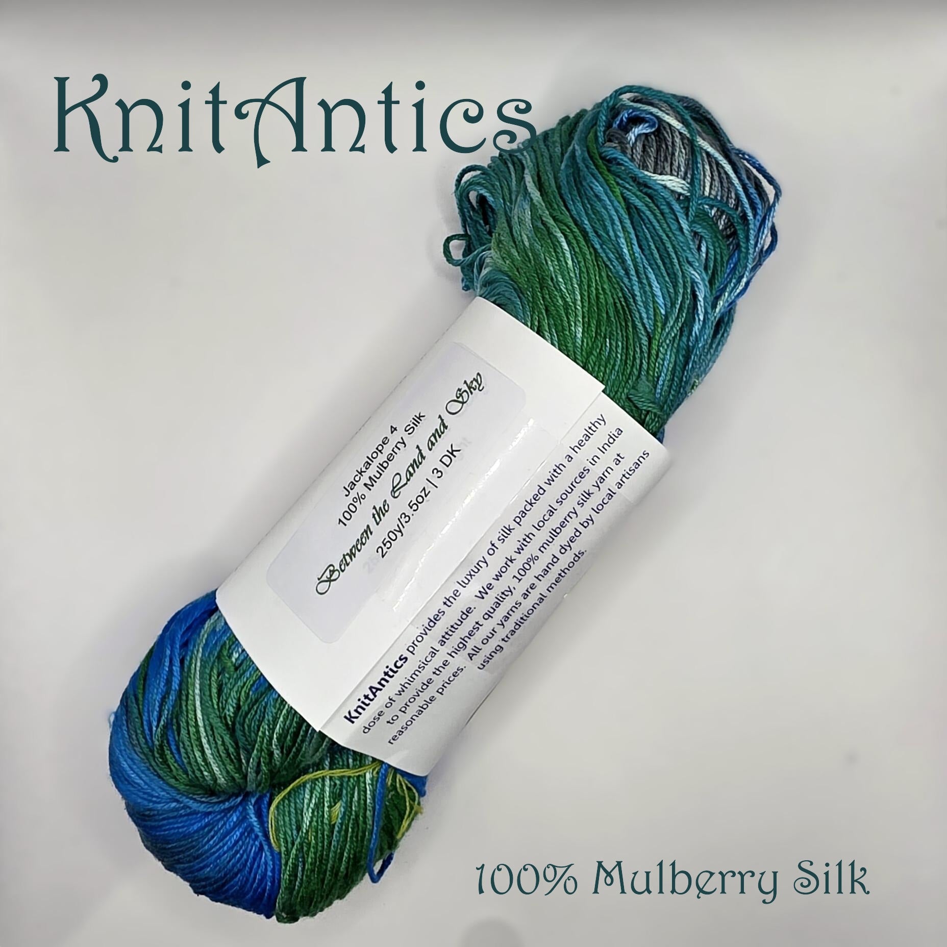 This yarn is created from 100% mulberry silk spun from the longer fibers remaining after the primary reeling and spinning processes. The color is rich and engaging, a riot of greens, blues, and greys, resembling the light of a forest on a late summer afternoon. Traditional dyeing techniques are used to create this limpid colorway.