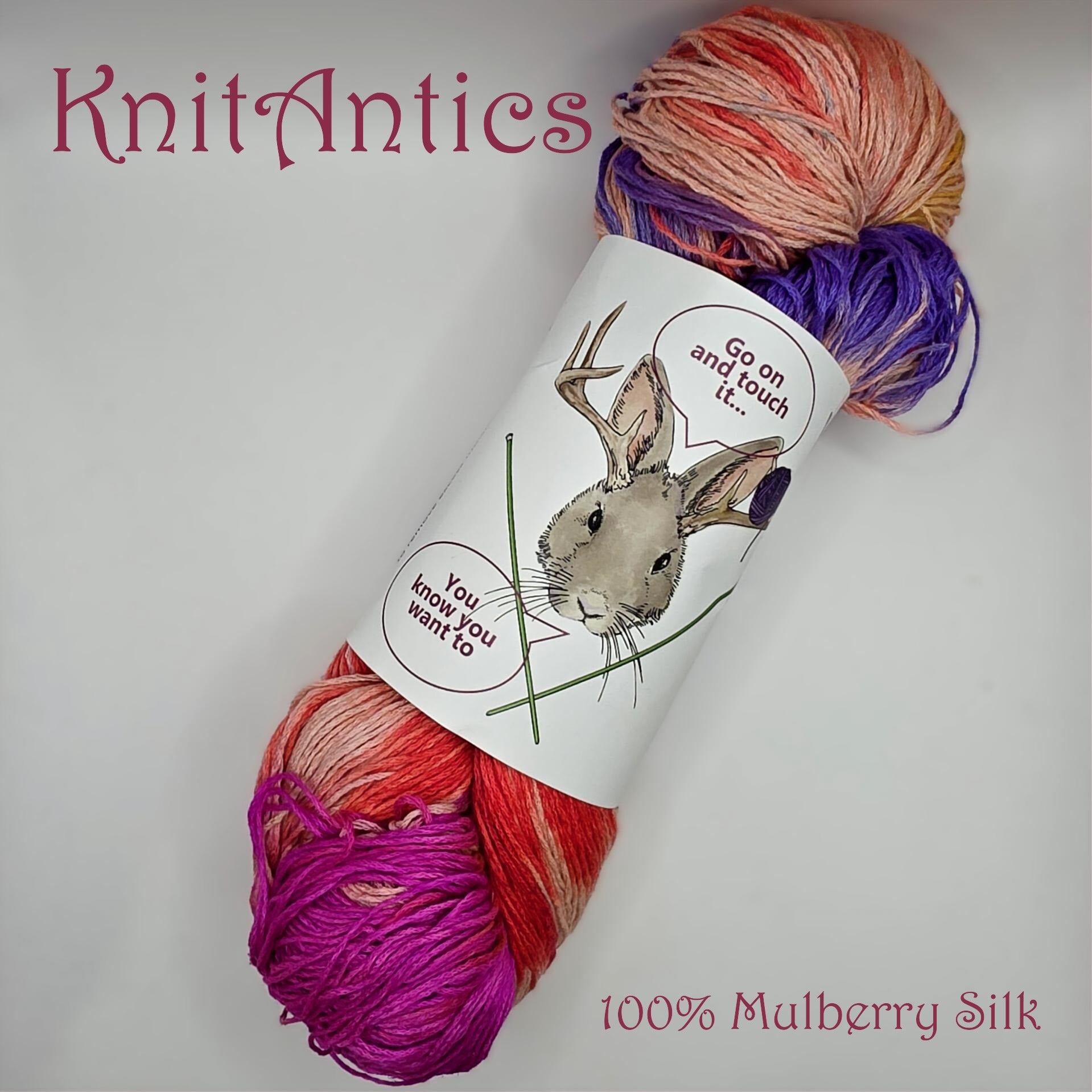 This yarn is created from 100% mulberry silk spun from the longer fibers remaining after the primary reeling and spinning processes. The color is rich and engaging, a clamor of purple, orange, and pink like lightning captured in yarn. Traditional dyeing techniques are used to create this festive colorway.