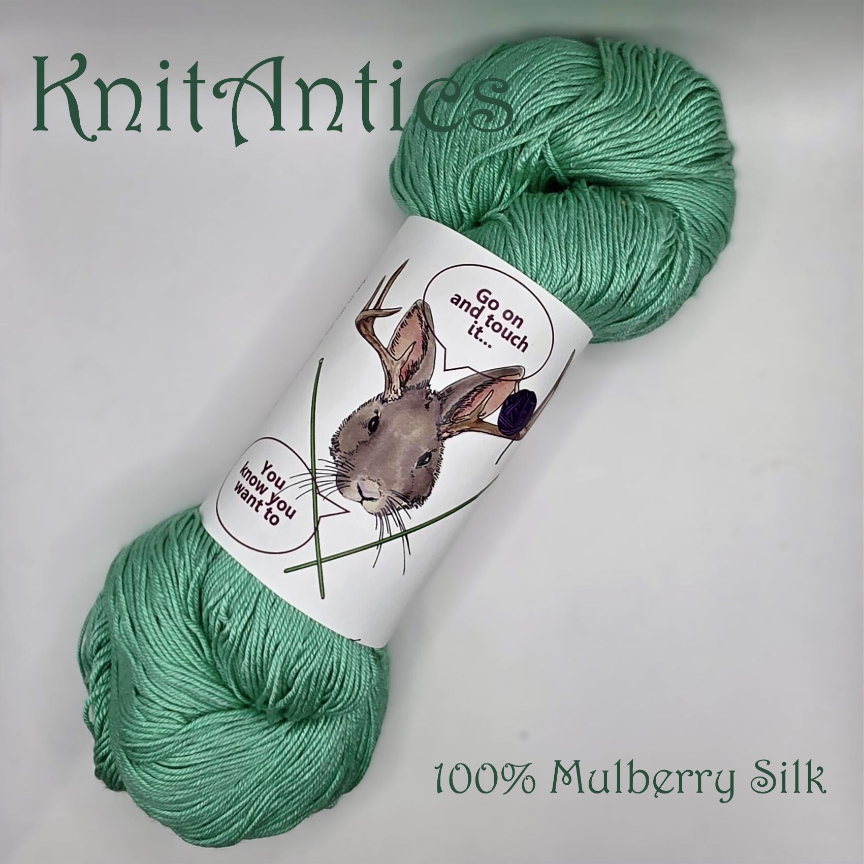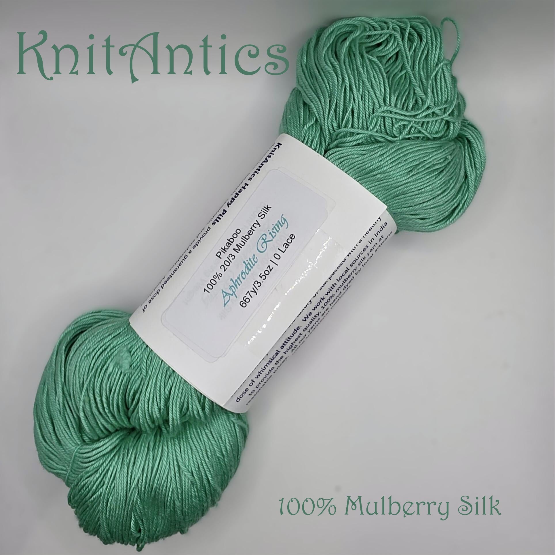 This yarn is created from 100% mulberry silk spun from the longer fibers remaining after the primary reeling and spinning processes. The color is rich and engaging, a calm minty green, just like the Goddess Herself would wear on her floating clam shell. Traditional dyeing techniques are used to create this solid color.