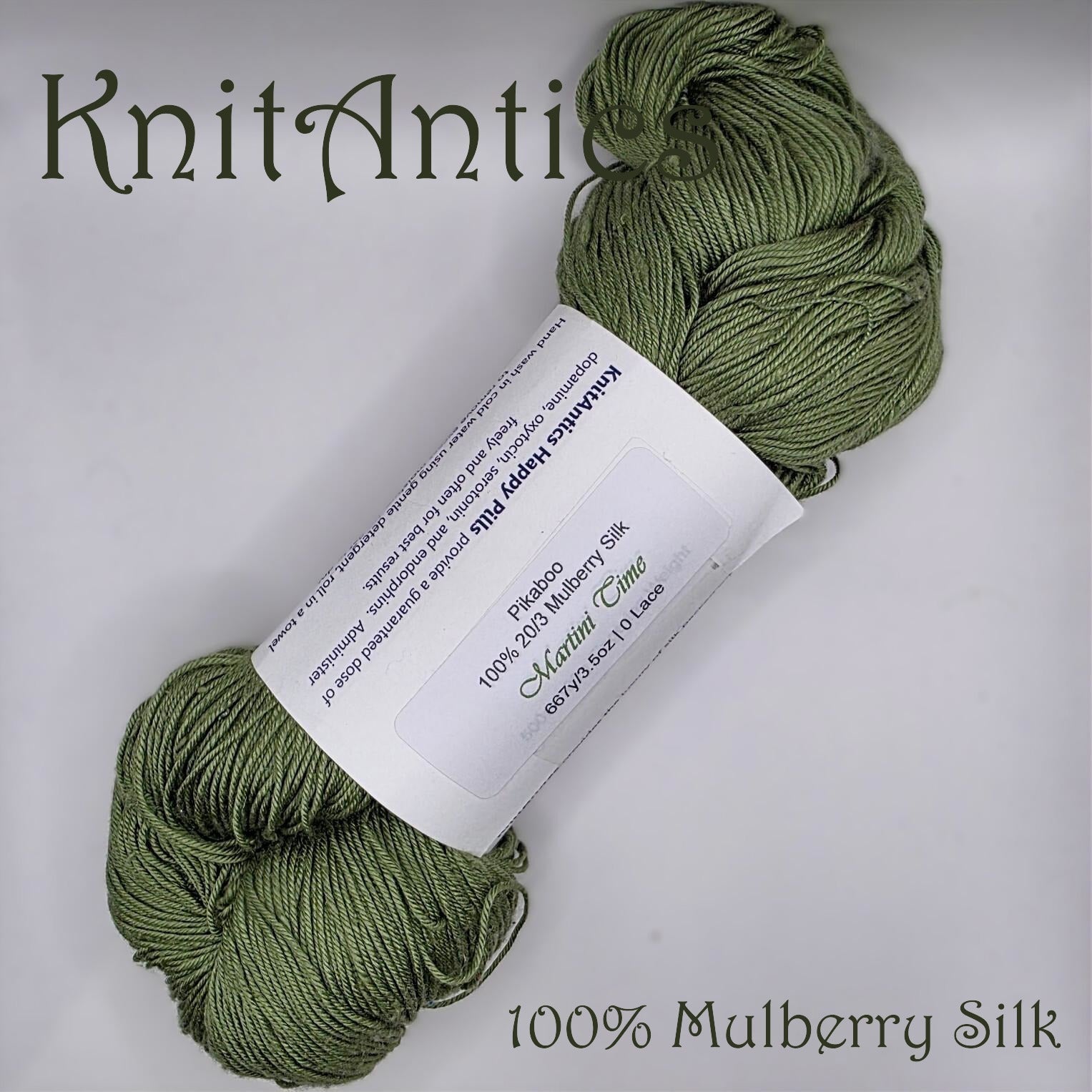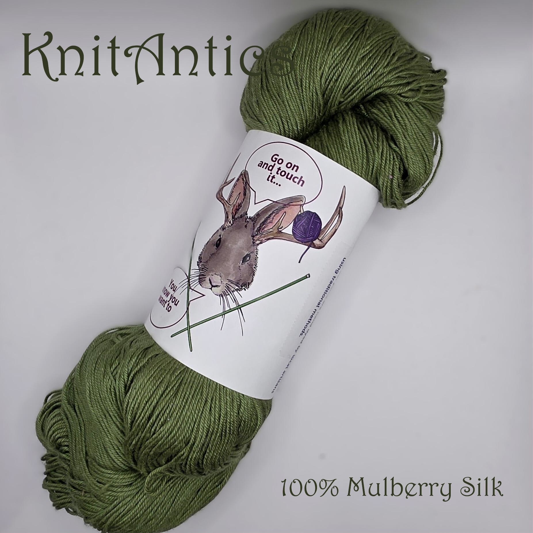 This yarn is created from 100% mulberry silk spun from the longer fibers remaining after the primary reeling and spinning processes. The color is a rich and engaging, like the perfect olives for your glass. Traditional dyeing techniques are used to create this solid color.